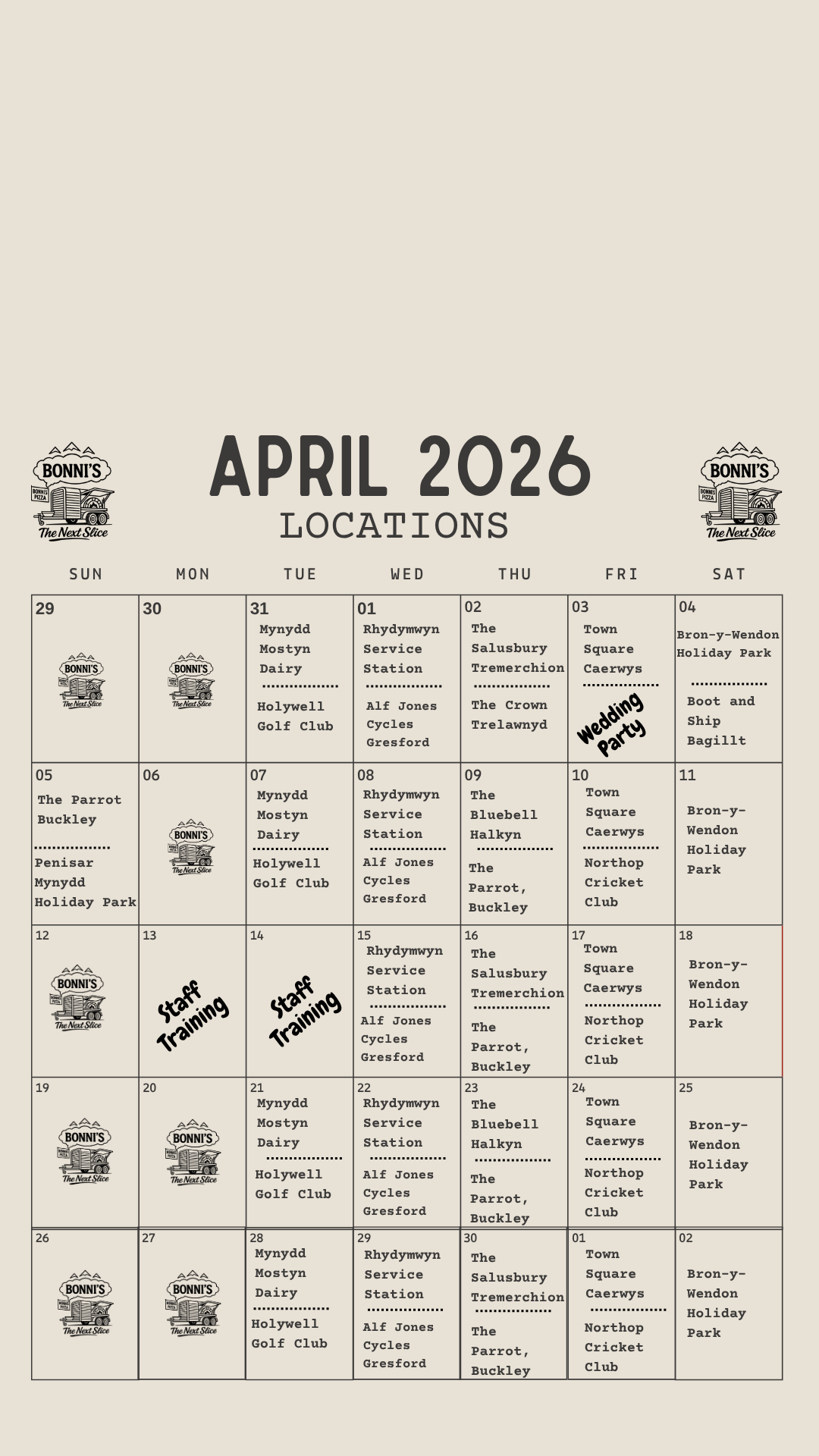 Weβre also excited to be adding new sites to our schedule π, bringing Bonniβs Pizza to even more locations. Despite some challenging weather at times π¦οΈ, weβve already had some fantastic events, including a brilliant 30th birthday celebration π and two wonderful weddings π each one an occasion we were proud to be part of.