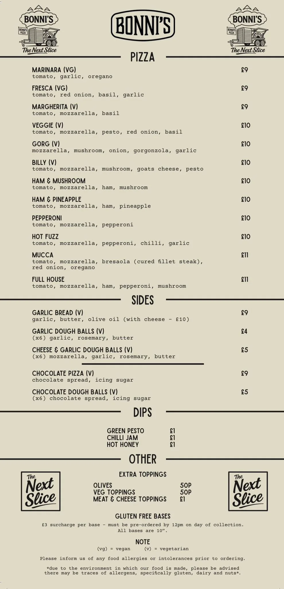 MARINARA (VG) MARGHERITA (V) VEGGIE (V) HOT FUZZ H+M GORG (V) FULL HOUSE HAM + PINEAPPLE BILLY (V) MUCCA PEPPERONI GARLIC BREAD PIZZA FRESCA (VG) GARLIC DOUGH BALLS (V) CHEESE & GARLIC DOUGH BALLS (V) NUTELLA DOUGH BALLS (V)